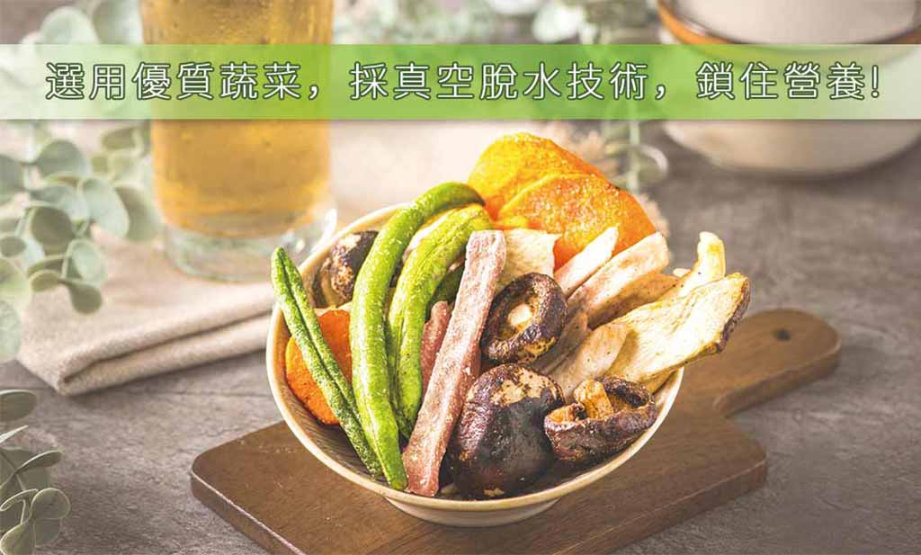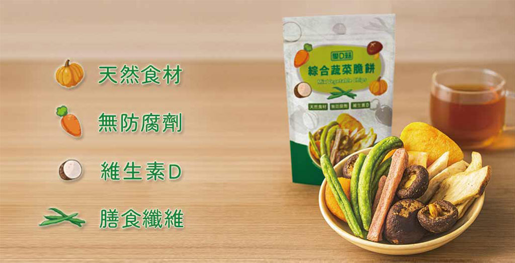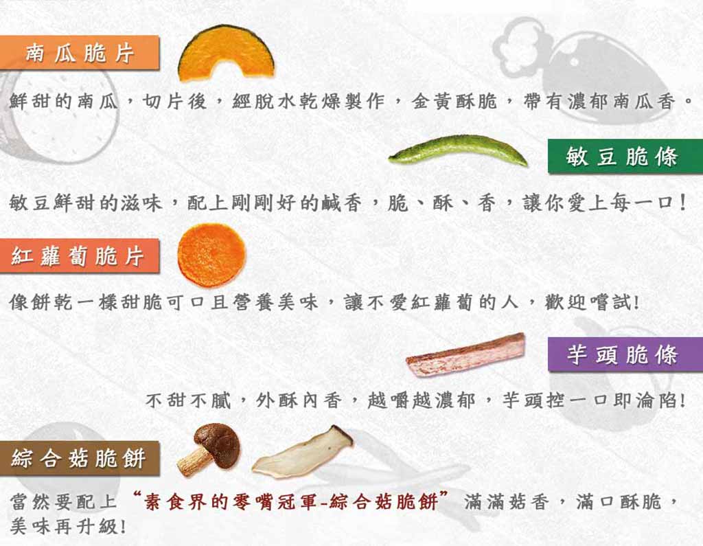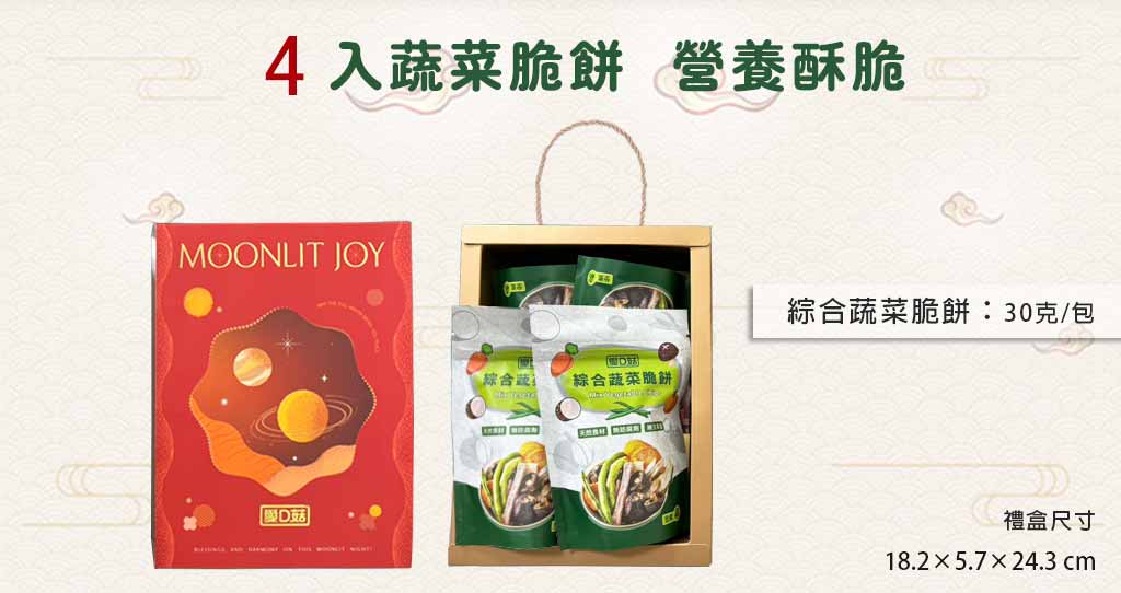 嚴選真蔬菜,酥脆不油膩,中秋送禮更有心。四入蔬菜脆餅,營養酥脆零負擔!選用台灣在地好菇及新鮮蔬菜,經真空脫水乾燥製成,保留食材原樣,五色蔬菜一次滿足,大人小孩都愛吃!