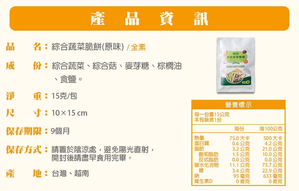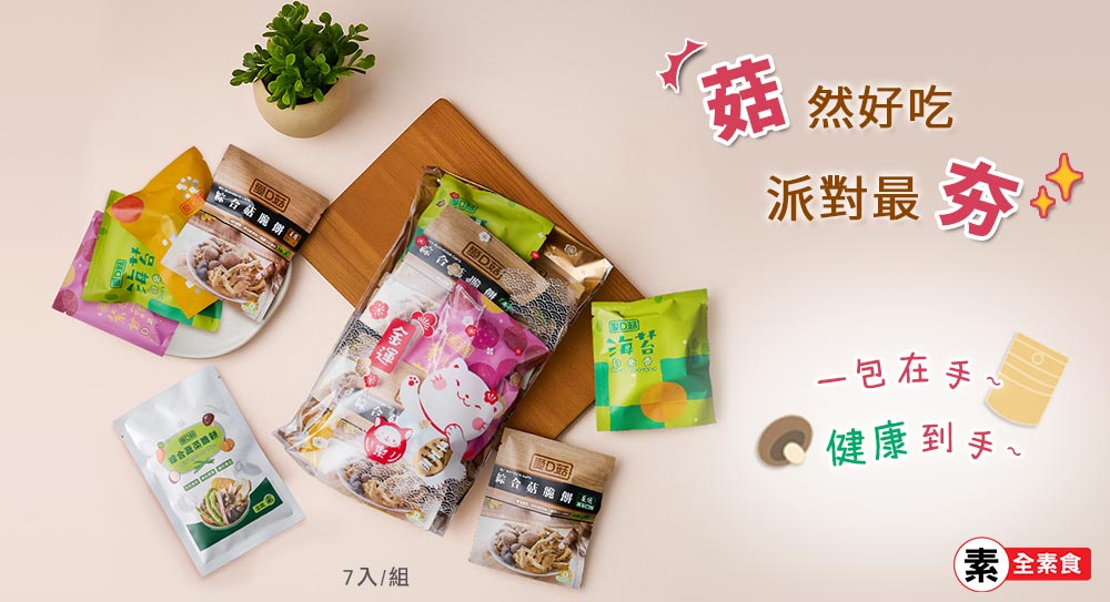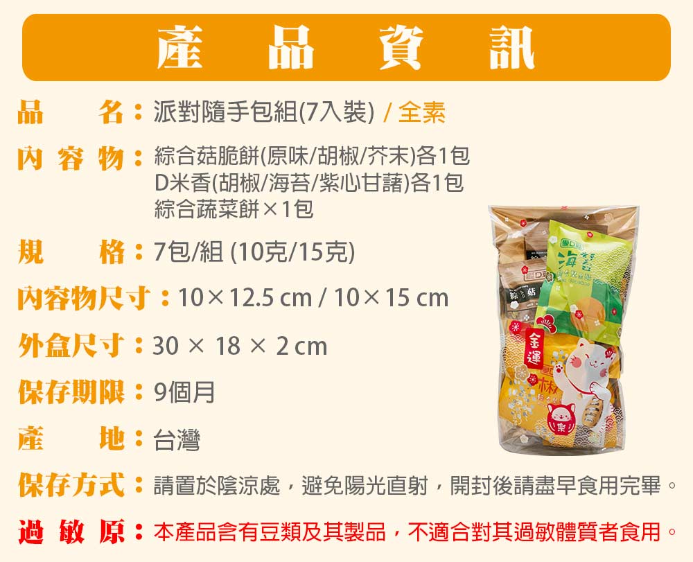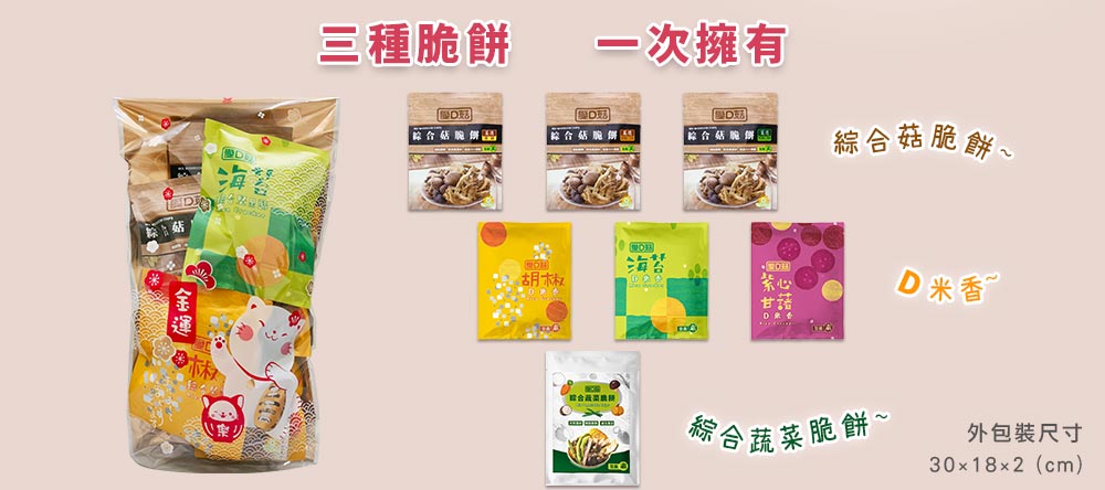 歡慶節日少不了舉辦派對~ 萬聖節、聖誕節、跨年派對及春節活動都要隨手來一包的綜合脆餅!! 裡面包含『D米香』胡椒、海苔及紫心甘藷等三種口味。『綜合菇脆餅』包含原味、胡椒、芥末三種口味,一次滿足~再加上『綜合蔬菜脆餅』,採真空脫水乾燥製程,完全不油膩,好吃健康無負擔!!