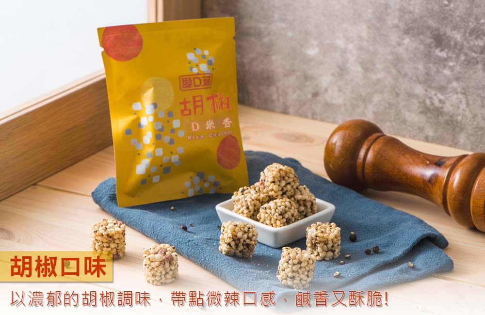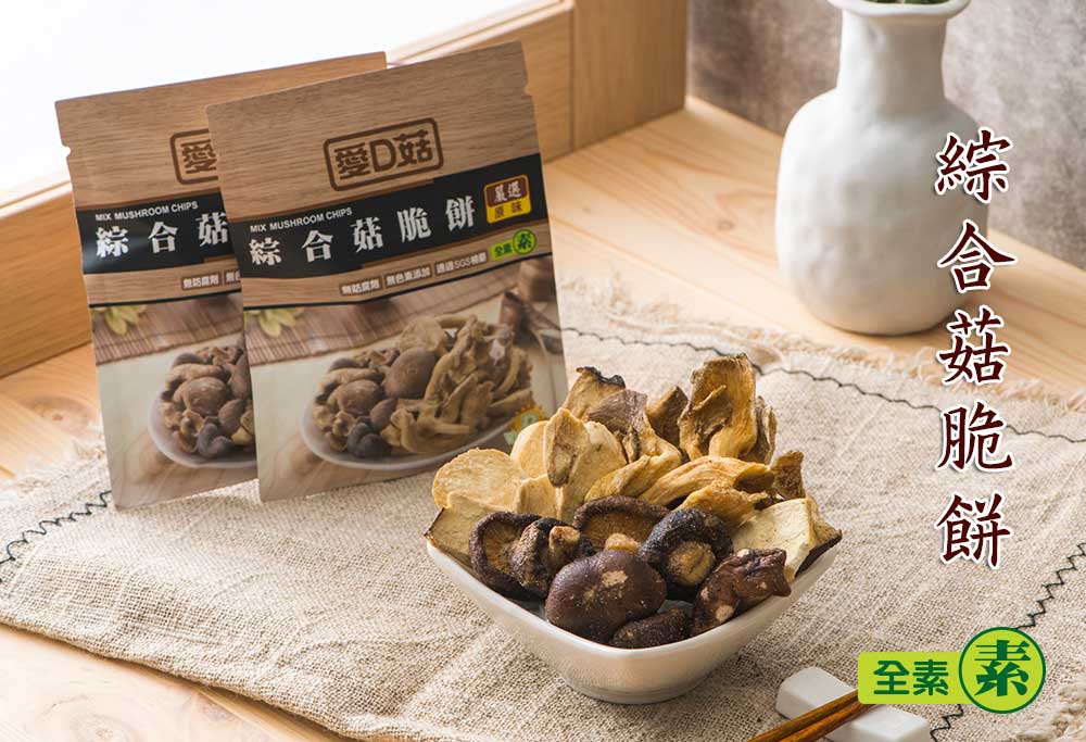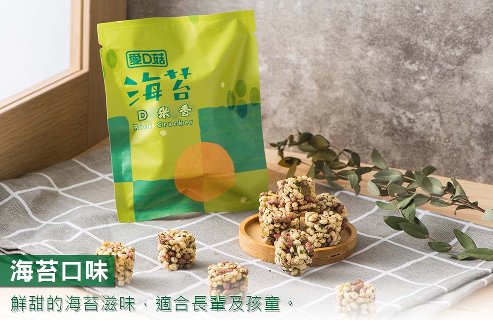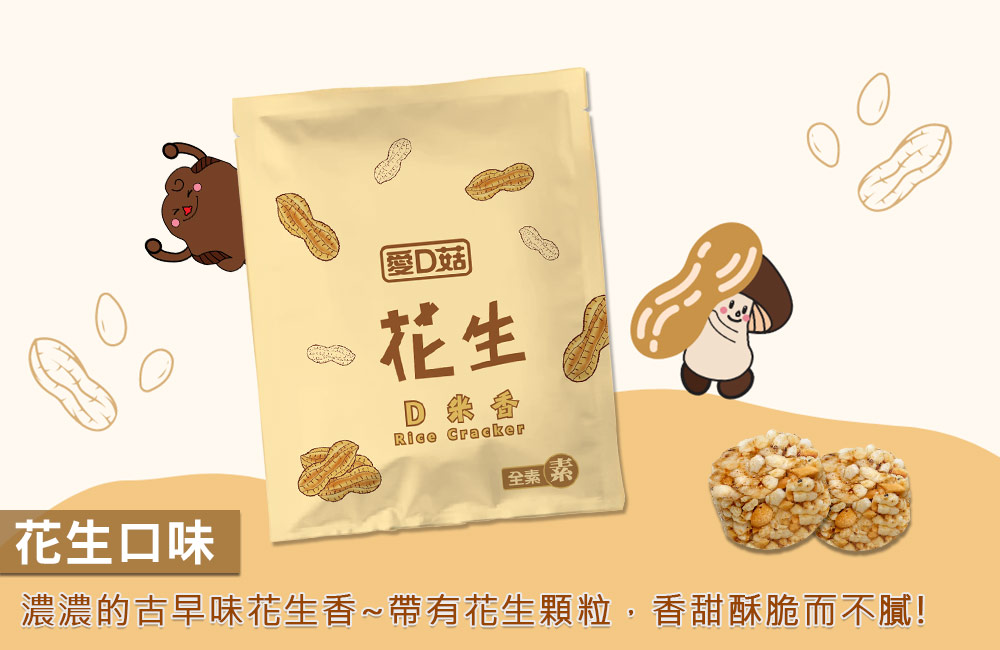 綜合菇脆餅簡單調味,保留原有香氣更加美味,口感清爽不油膩,6種口味任您搭配。D米香不同於一般的黏牙油膩口感,滿滿的堅果香搭配台灣好米及黑木耳粉,酥脆又美味! 使用了全台唯一先進的光照技術,利用UVB讓菇菇們產生了維生素D,愛吃零嘴的您,也也能夠吃得健康。