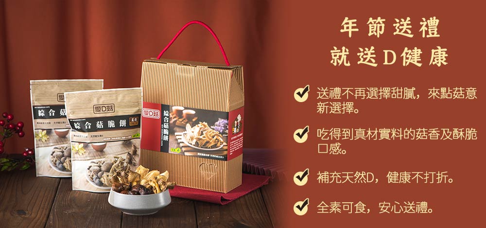 綜合菇脆餅禮盒包含香菇、袖珍菇及杏鮑菇等3種組合(原味/胡椒),口感酥脆不油膩,吃零食也能健康吃。愛D菇禮盒全部都是『全素禮盒』,為吃素食者的最佳首選。