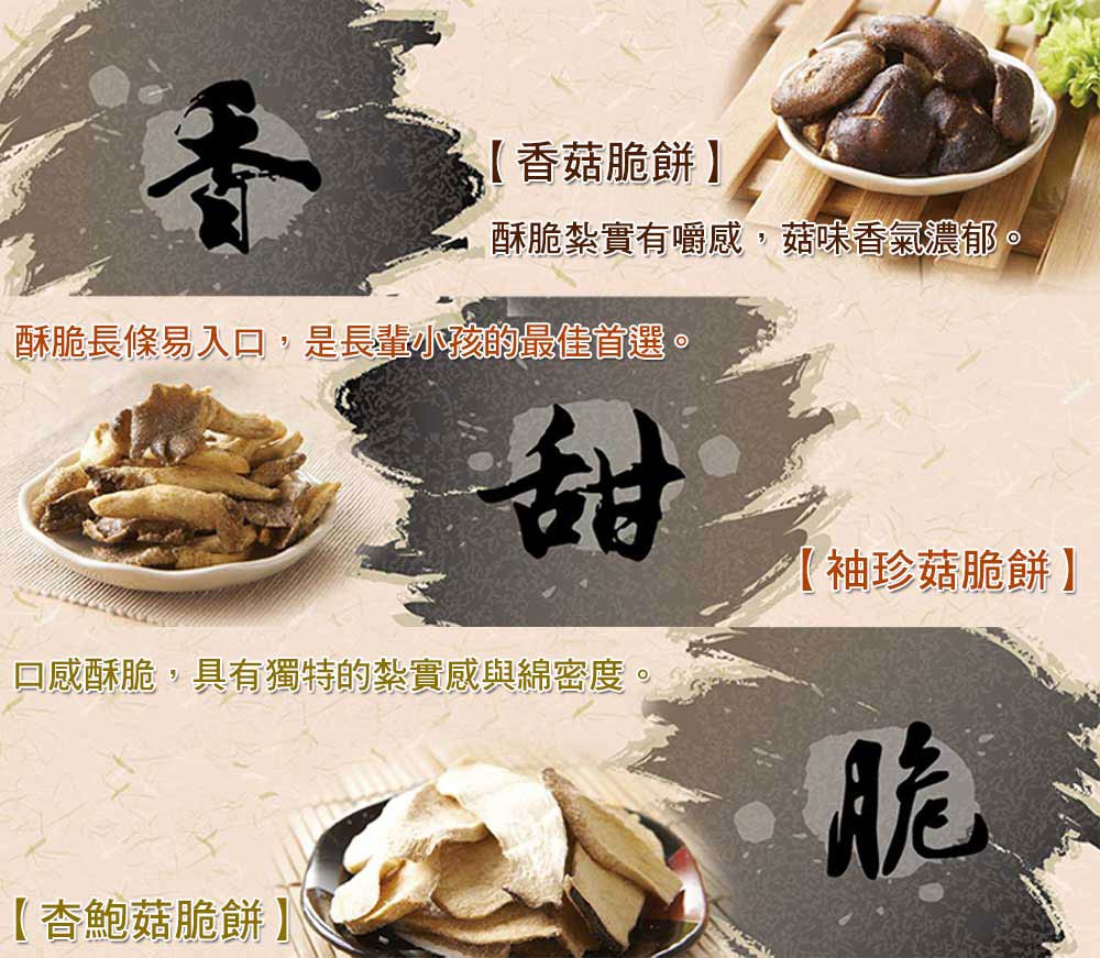 內容物:綜合菇脆餅(原味)×1包;綜合菇脆餅(胡椒)×1包