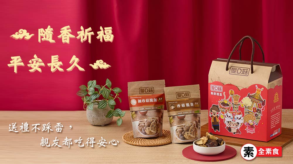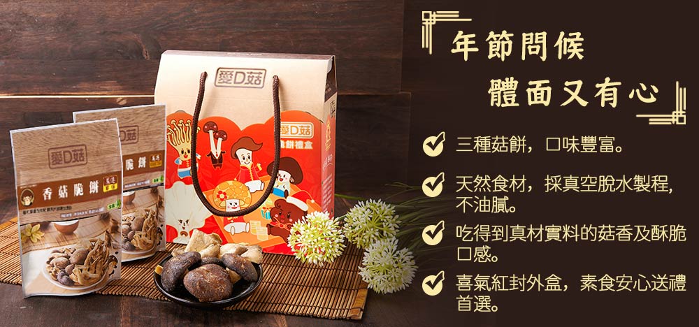愛D菇脆餅手繪禮盒包含香菇、袖珍菇、杏鮑菇兩種口味組合(原味/胡椒),口感酥脆不油膩,吃零食也能健康吃。愛D菇禮盒全部都是『全素禮盒』,為吃素食者的最佳首選。