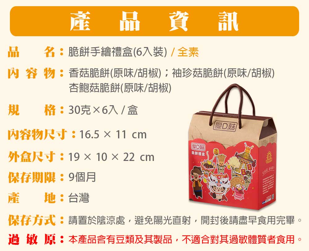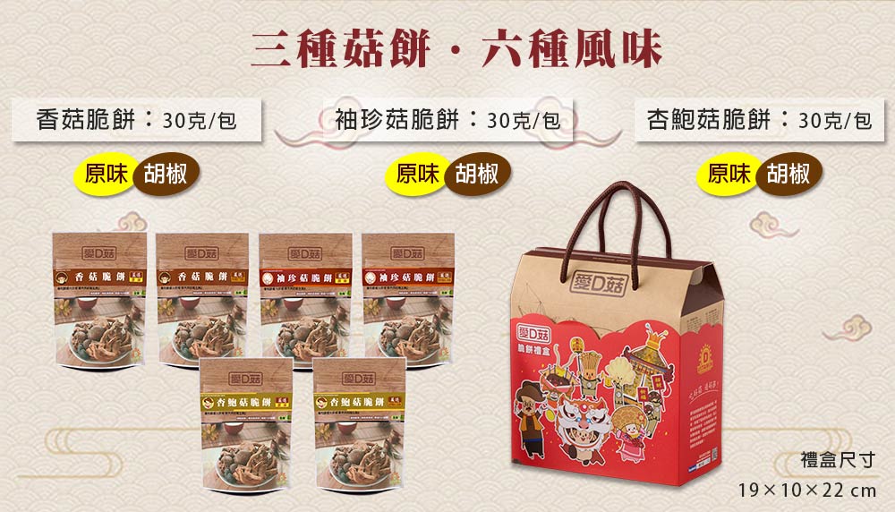 內容物:香菇脆餅(原味/胡椒);袖珍菇脆餅(原味/胡椒);杏鮑菇(原味/胡椒)