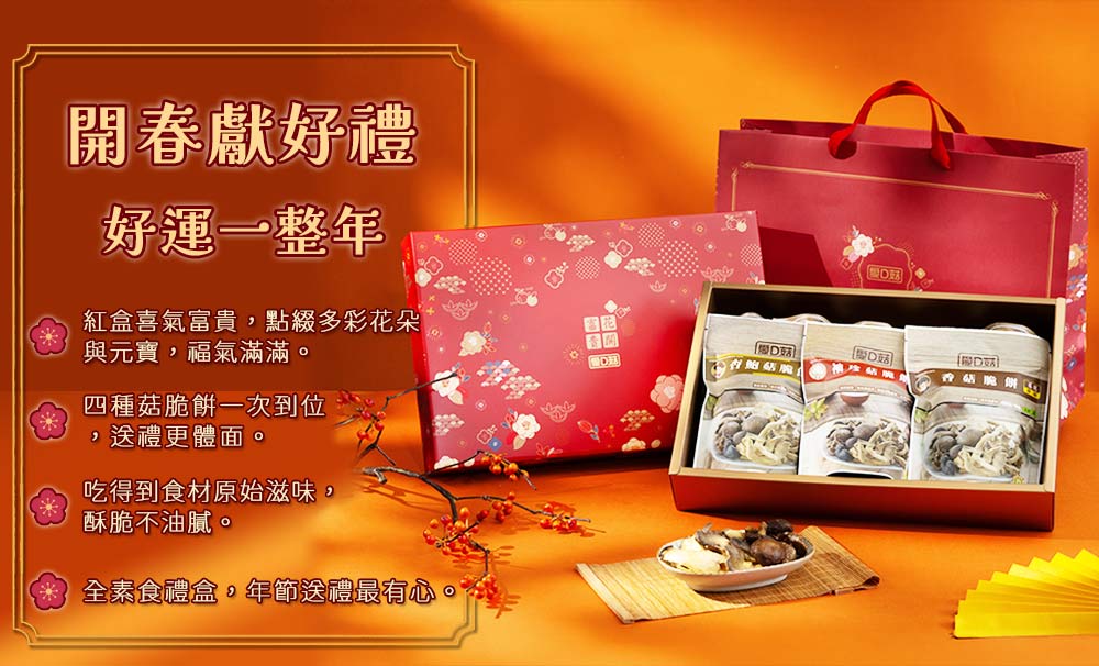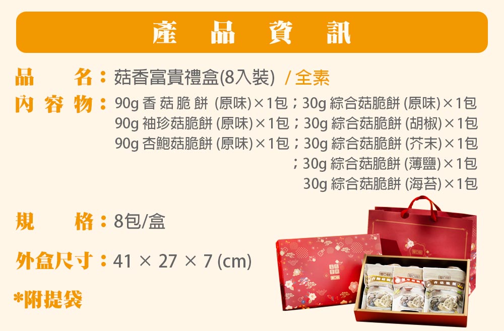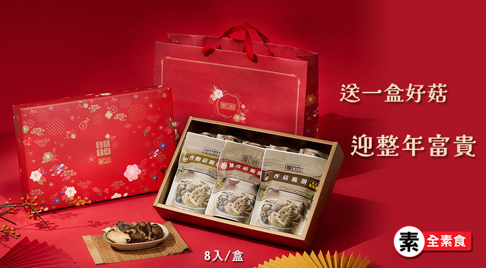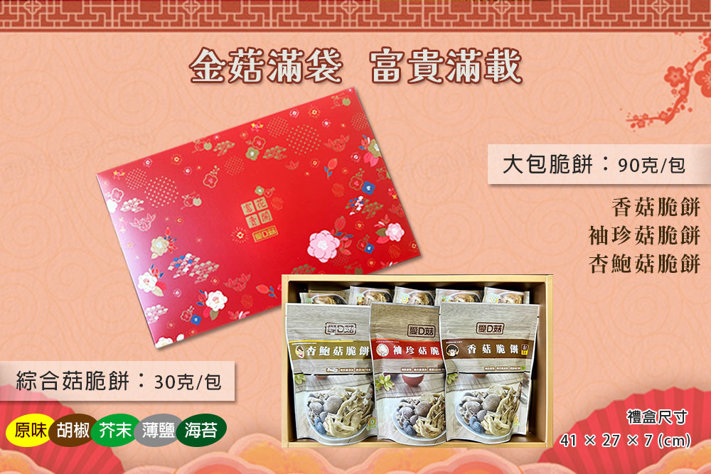 愛D菇-菇香富貴禮盒,內容包含香菇、袖珍菇、杏鮑菇三種原味,加上綜合菇脆餅等五種口味組合,口感酥脆不油膩,吃零食也能健康吃。愛D菇禮盒全部都是『全素禮盒』,為吃素食者的最佳首選。