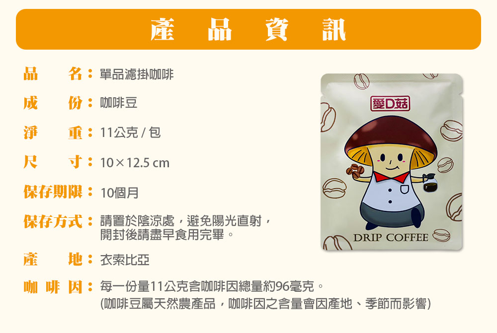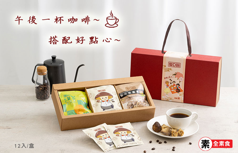 年節送禮首選,點心咖啡禮盒,內容物包含綜合菇脆餅及D米香,口感酥脆不油膩,兩種脆餅,6種風味一次滿足。另外搭配中淺焙花果香帶微酸風味的『濾掛咖啡』。完美點心組合,健康又美味。